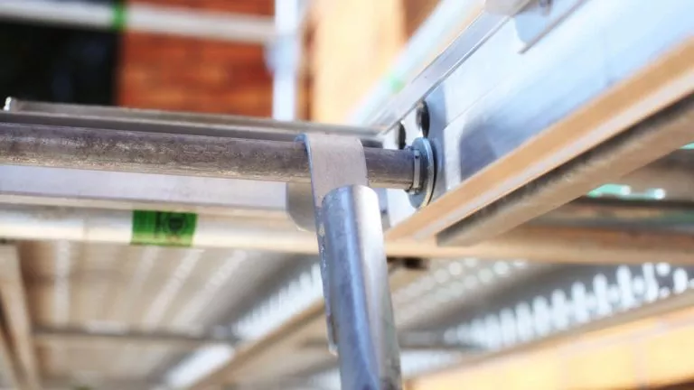 The assembly is carried out by hammering a transom ended with a wedge into the groove of the stand. The diagonal elements of the scaffolding, the so-called bracing, are made of a pipe ended with half-joints, the bracing gives the scaffolding structure the required rigidity. Transverse wooden platforms as well as perforated steel can be used in the scaffolding, the height of the working platform can be adjusted every half meter of height on the scaffolding. Scaffolding elements are protected from corrosion by hot-dip galvanizing. Wedge scaffolding is popular in the shipbuilding industry as well as for placing the facades of larger buildings or detached houses.