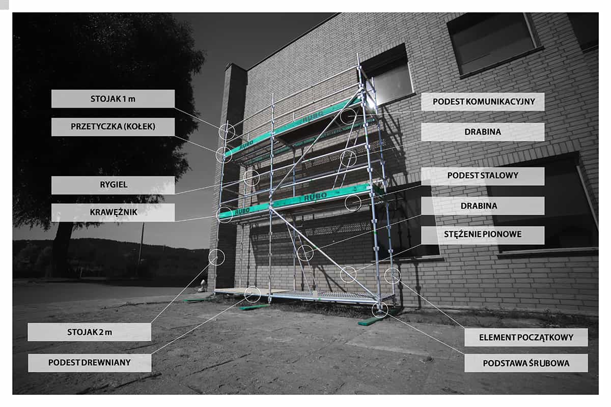 Rubo-Konstrukcje offers wedge scaffolding. It is a system of racks and transoms connected by means of wedges and grooves, which have replaced the cross and swivel joints once used. The wedge joint system allowed the scaffolding to be formed into the desired shape and thus makes it easier to reach hard-to-reach places. All steel components of Rubo RK scaffolding were painted in the characteristic green colour. Currently, Rubo RK wedge scaffolding is only produced in a galvanised version.