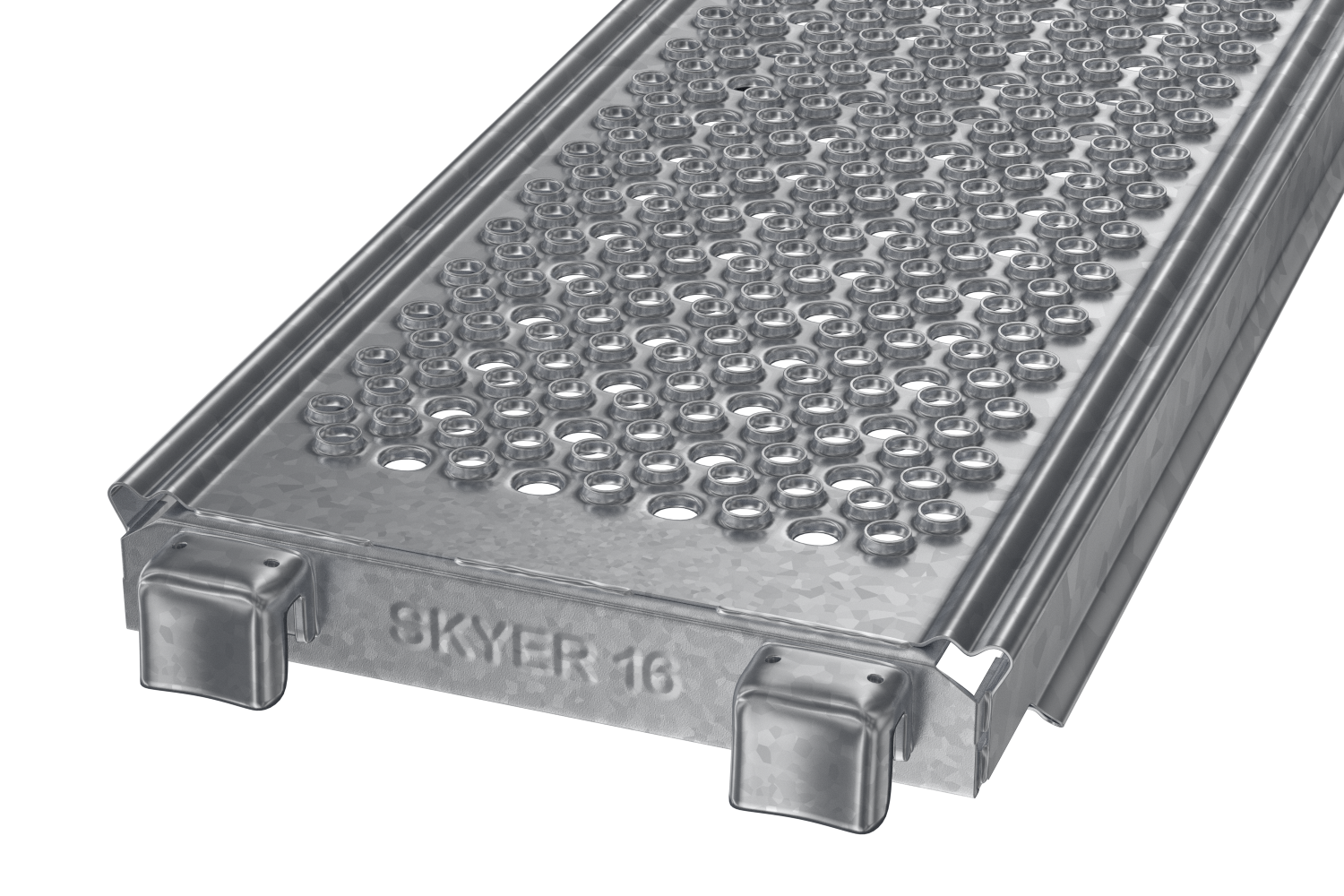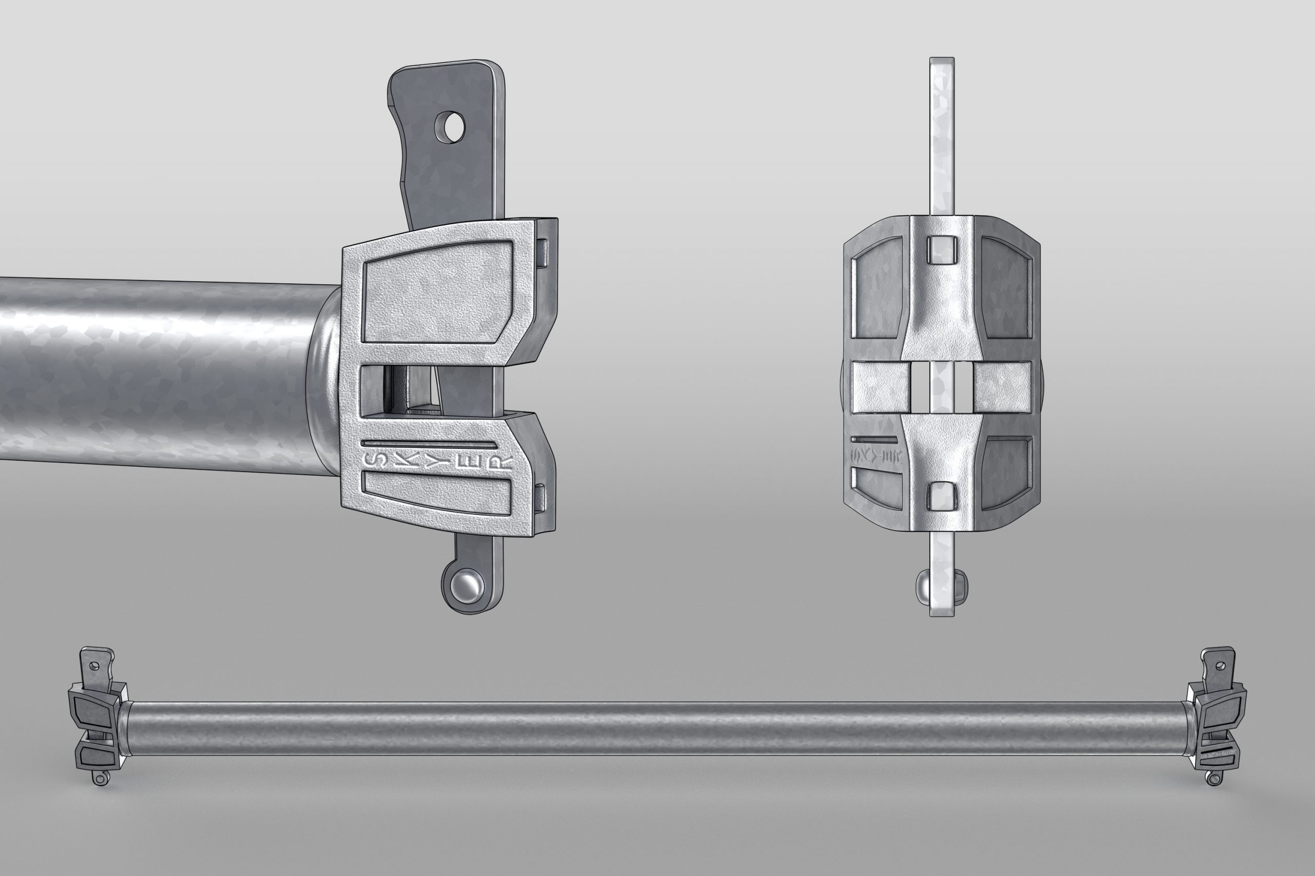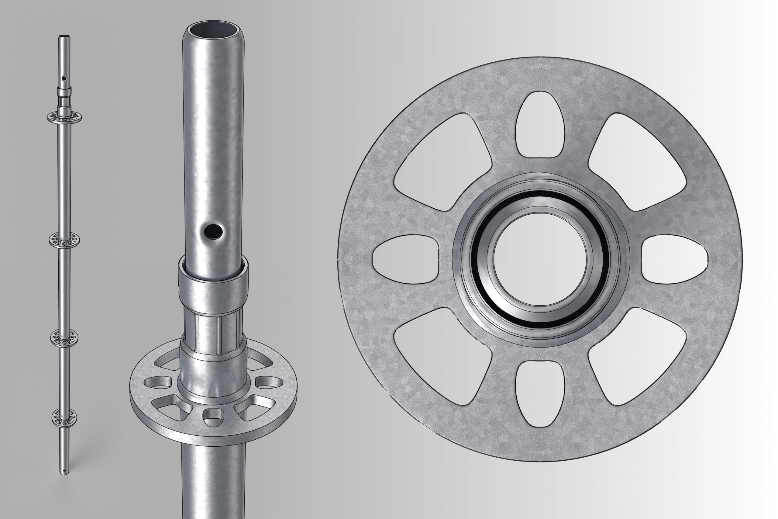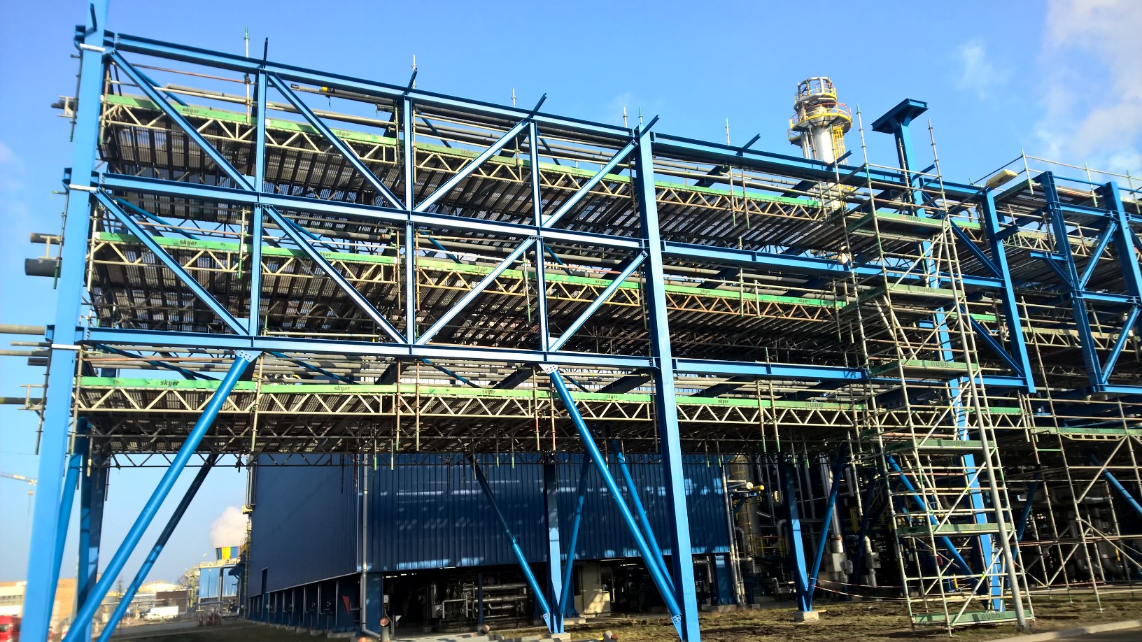 SKYER modular scaffolding is a spatial scaffolding. In the standard façade setup, it comes in field lengths: 3.07 m, 2.57 m, 2.07 m, 1.57 m, 1.09 m, 0.73 m, and in depths of 0.73 m and 1.09 m. The scaffold can be built up to a height of 24 m – without additional static calculations. The vertical elements of the modular scaffolding, called stands, have rosettes (plates) that make the SKYER system possible to build at any angle. The rosettes occur every 0.5 meters, making it easy to set the working platforms at the required level, and as many as 8 elements can be fastened together in a single assembly “node”. The scaffolding grid is also formed by horizontal (transoms) and diagonal (bracing) elements. The transoms, as well as the braces, end with a wedge head, which, combined with a rosette in the rack, creates a stable connection. The SKYER system, through the use of a rosette connection with a wedge, makes the connected elements align at the correct angle. The wide range of possibilities of the scaffolding makes it suitable for use in various industries, including shipbuilding, refining, energy industry and construction.