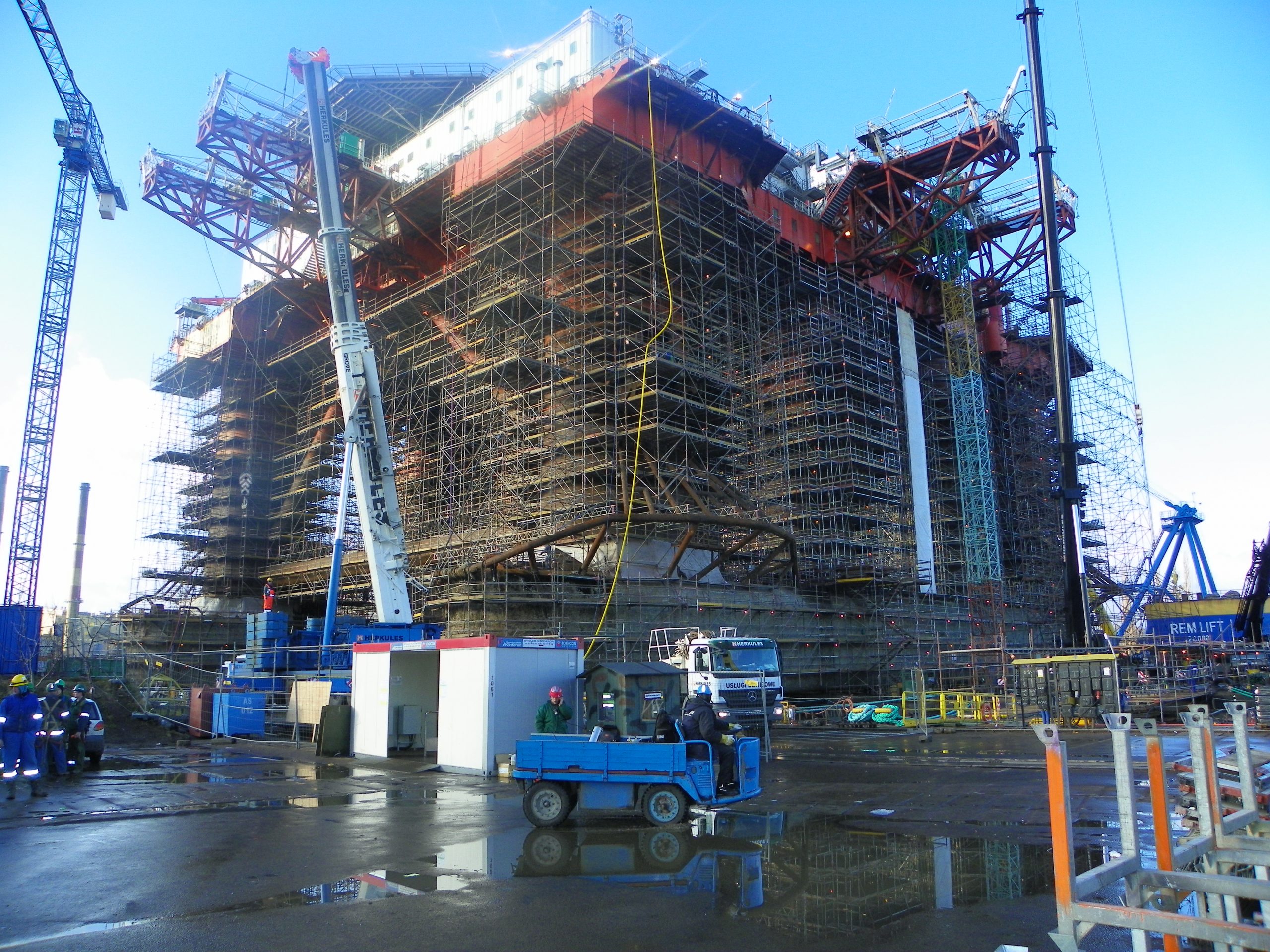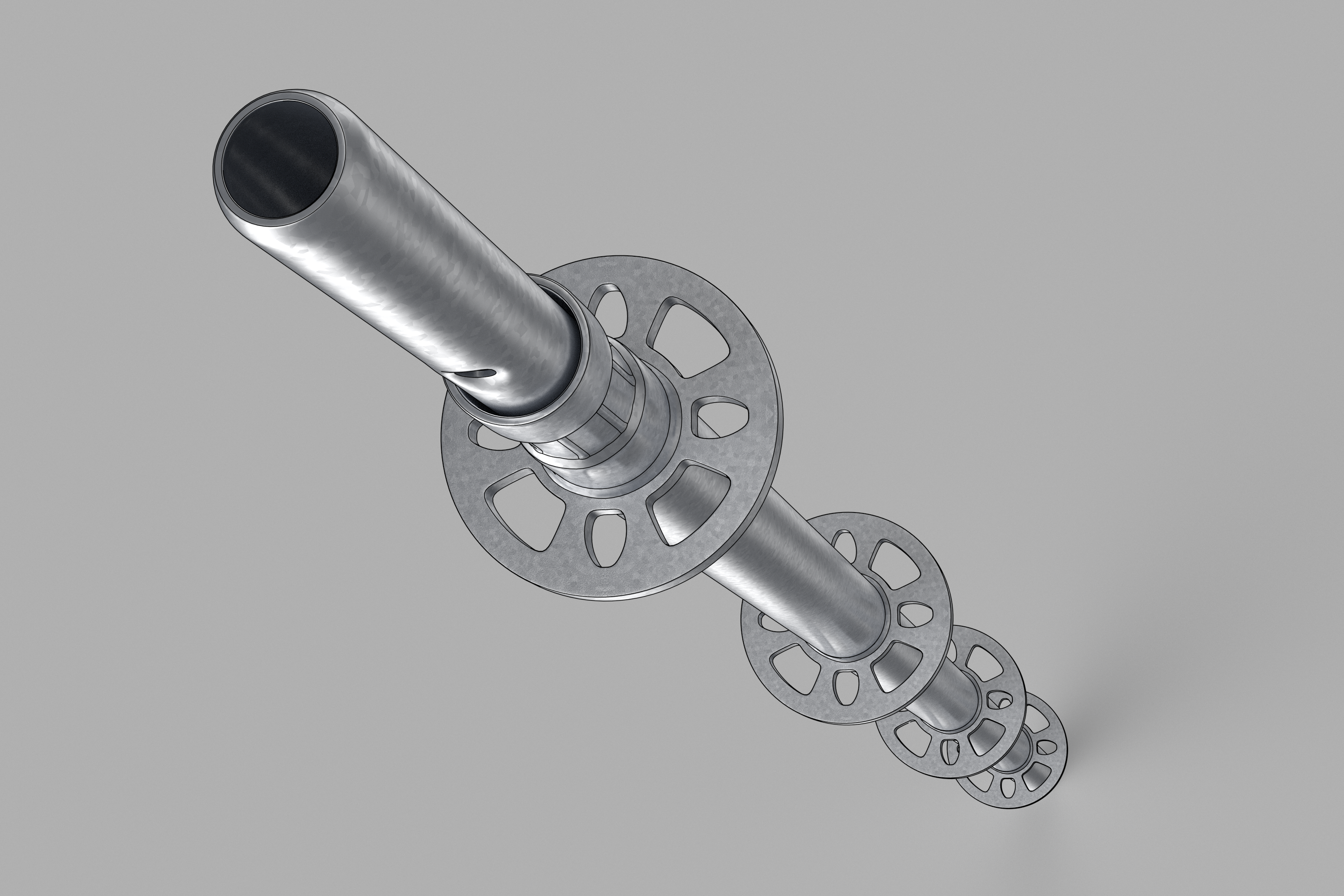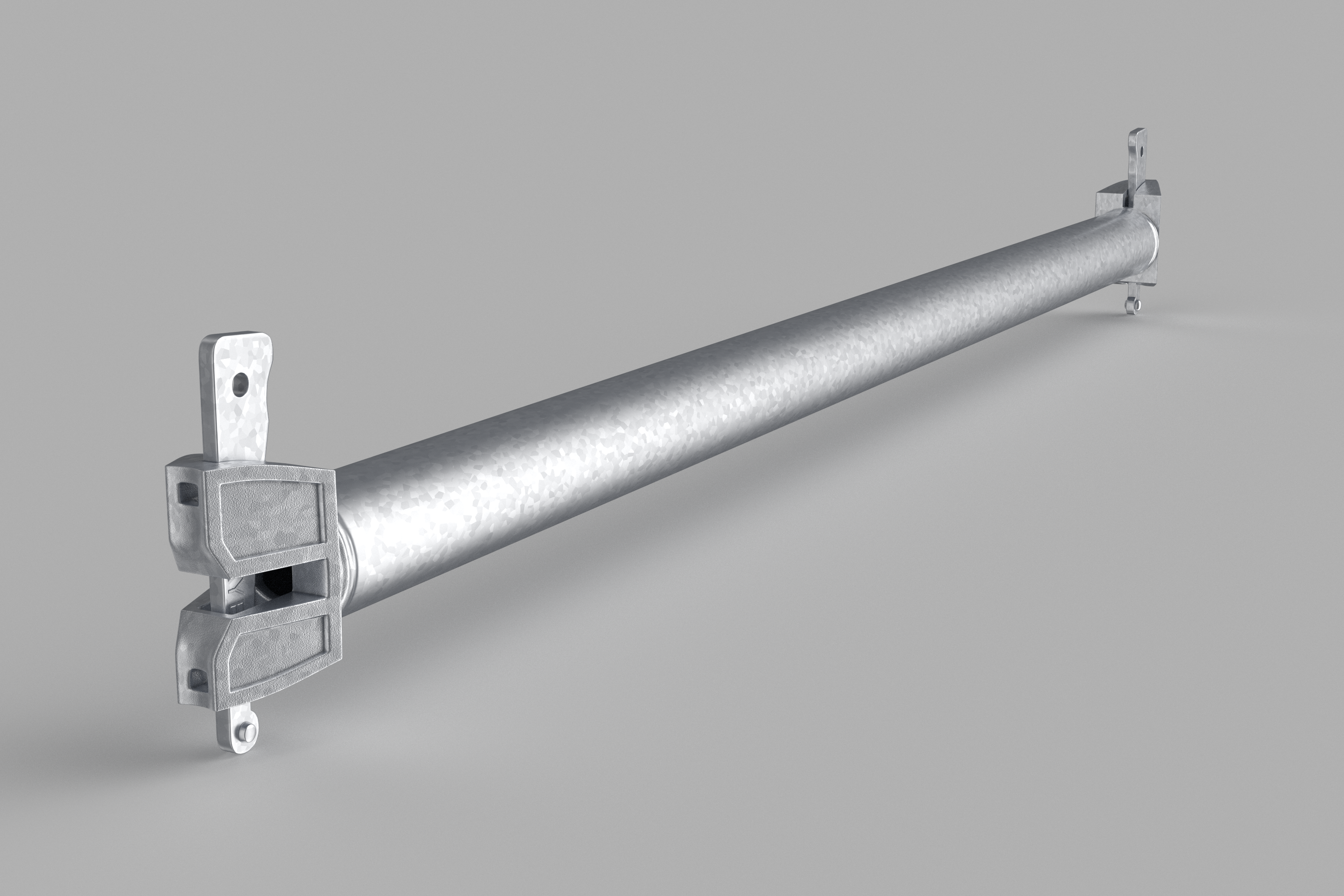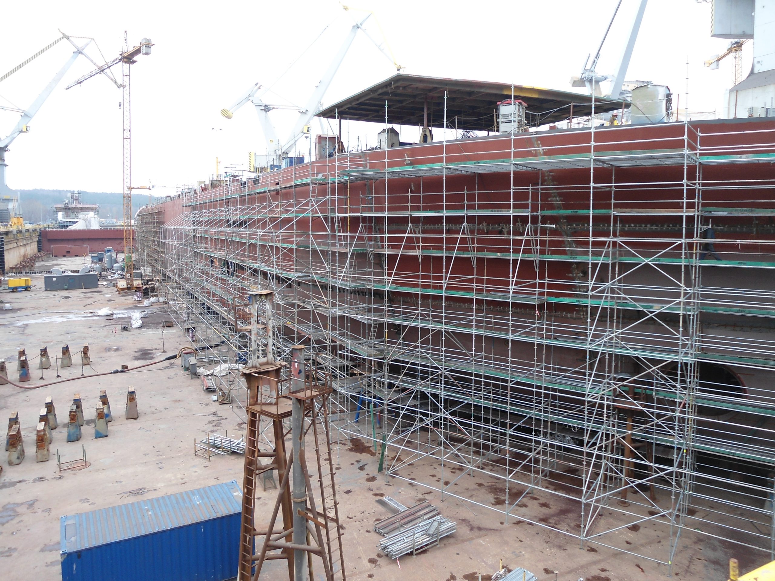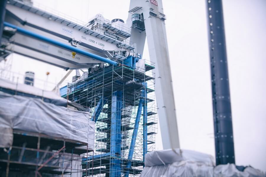 SKYER modular scaffolding is a spatial scaffolding. In the standard façade setup, it comes in field lengths: 3.07 m, 2.57 m, 2.07 m, 1.57 m, 1.09 m, 0.73 m, and in depths of 0.73 m and 1.09 m. The scaffold can be built up to a height of 24 m – without additional static calculations. The vertical elements of the modular scaffolding, called stands, have rosettes (plates) that make the SKYER system possible to build at any angle. The rosettes occur every 0.5 meters, making it easy to set the working platforms at the required level, and as many as 8 elements can be fastened together in a single assembly “node”. The scaffolding grid is also formed by horizontal (transoms) and diagonal (bracing) elements. The transoms, as well as the braces, end with a wedge head, which, combined with a rosette in the rack, creates a stable connection. The SKYER system, through the use of a rosette connection with a wedge, makes the connected elements align at the correct angle. The wide range of possibilities of the scaffolding makes it suitable for use in various industries, including shipbuilding, refining, energy industry and construction.