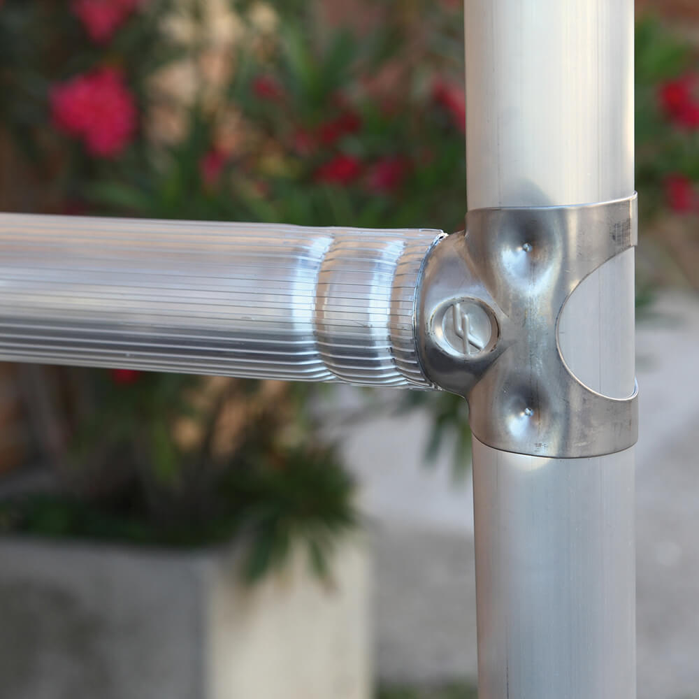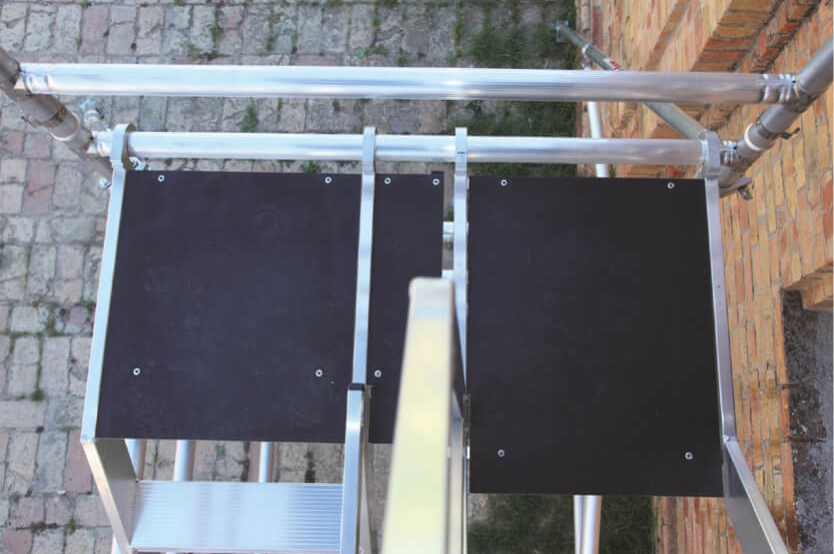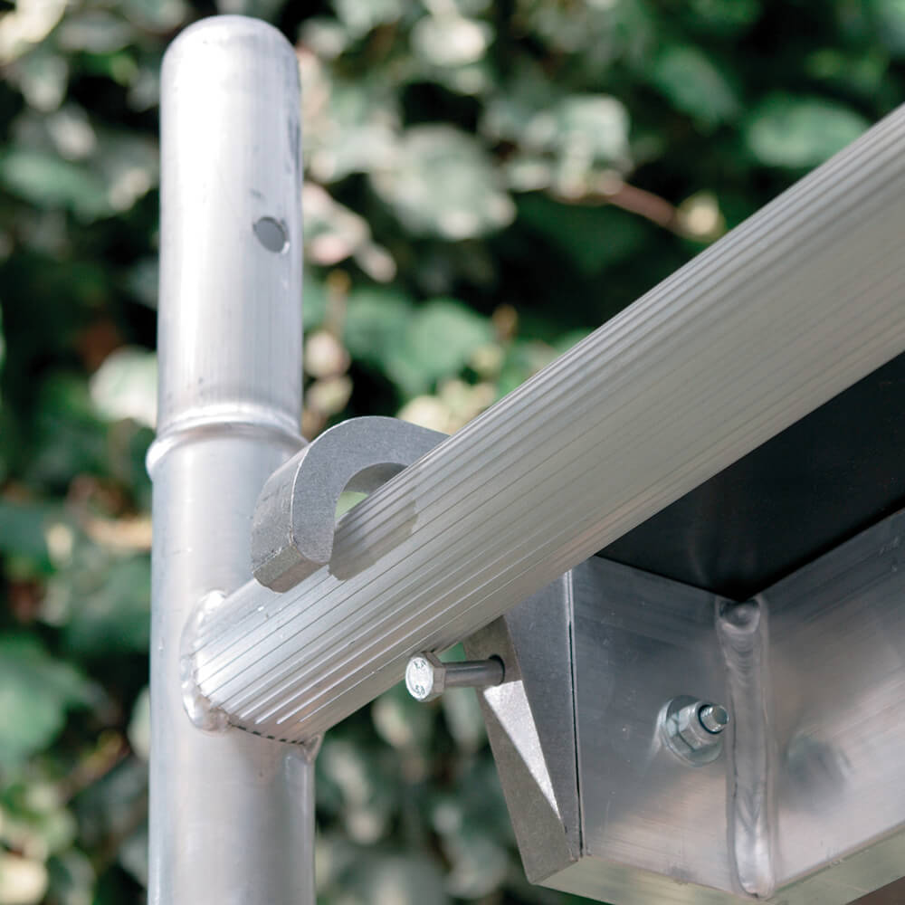 Poręcze i stężenia jak pozostałe części rusztowania wykonane są z aluminium, montaż do ramy następuje za pomocą samozatrzaskowych mocowań w kształcie litery C, dzięki czemu montaż jest szybki, łatwy i bezpieczny.