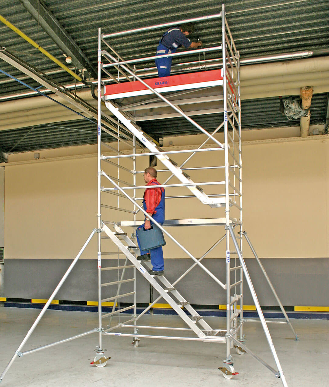 W naszym asortymencie znajdziecie Państwo atestowane konstrukcje jezdne wykonane przez producenta Krause. Rusztowanie aluminiowe tego rodzaju wyposażone jest w rolki jezdne o regulowanej wysokości, dzięki czemu łatwo można je przystosować do nierównego podłoża i tym samym zapewnić konstrukcji stabilne podparcie. Każde rusztowanie jezdne z naszej oferty cechuje nośność – do 200 kg/m2. Warto wspomnieć o tym, że topowe rusztowania serii Protec oraz Stabilo producenta Krause wyposażone są w hamulec, który dodatkowo stabilizuje rolki jezdne. Przy wyższych zestawach dodatkową zaletą tej konstrukcji są dodatkowe podpory boczne. Niektóre modele z serii Stabilo posiadają stalowe stabilizatory (podstawę) oraz połączenia samozaciskowe gwarantujące szybki montaż.