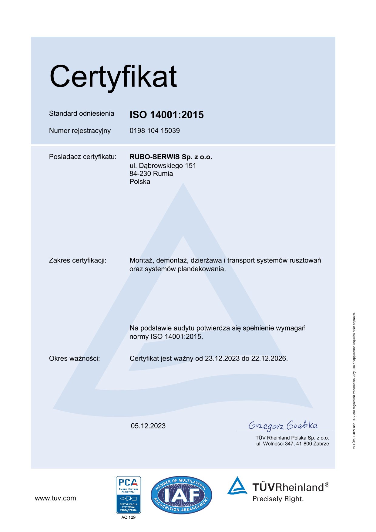 Firma RUBO-SERWIS Sp. z o.o. funkcjonuje w oparciu o certyfikowany Zintegrowany System Zarządzania wg. norm ISO 9001:2015, ISO 14001:2015, ISO 45001:2018 oraz standardu SCC:2011.